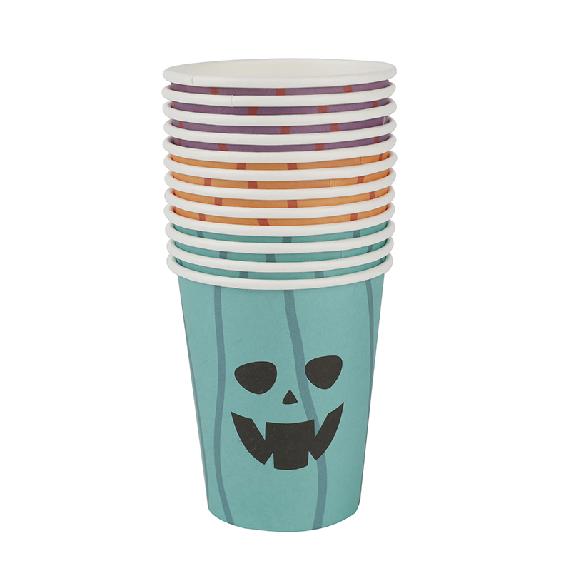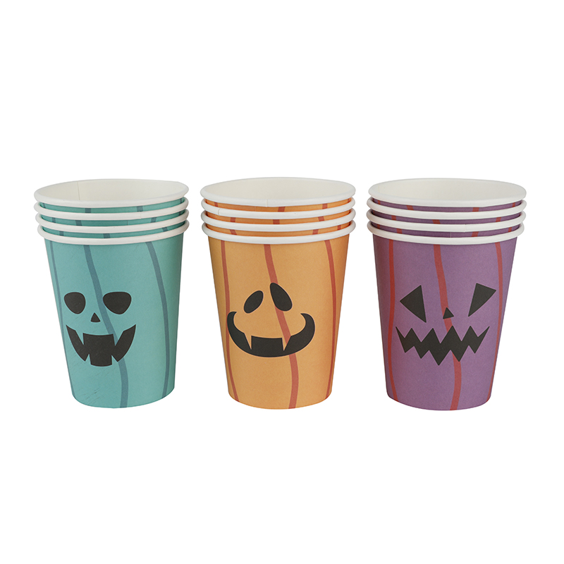 Halloween paper cups, scary pumpkin paper cups, three patterns, with a small leaf on the paper cups, you can DIY by yourself; thickened, leak-proof, disposable and environmentally friendly, suitable for all kinds of parties.