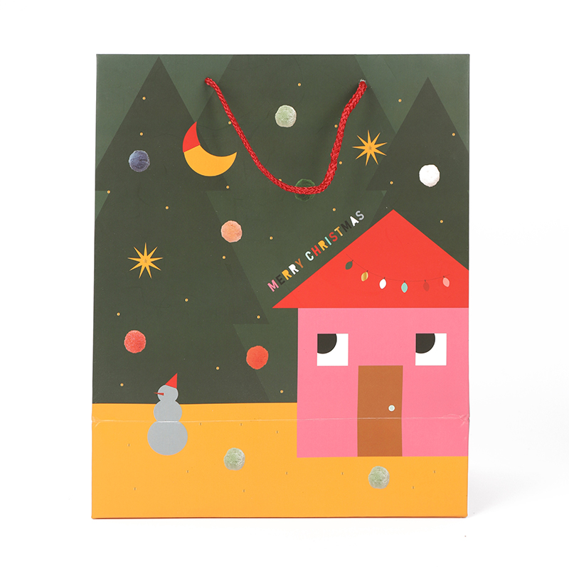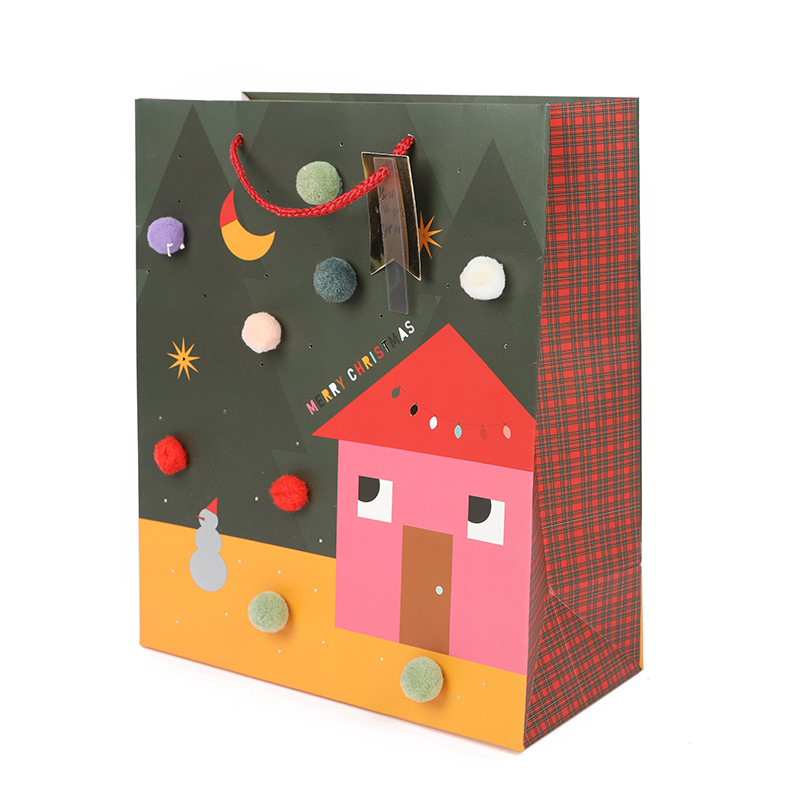Finish:4C+hot foil stamp +matte lamination grommet,several colorful pom pom at front,red elastic handle,2pcs transparent PET tags